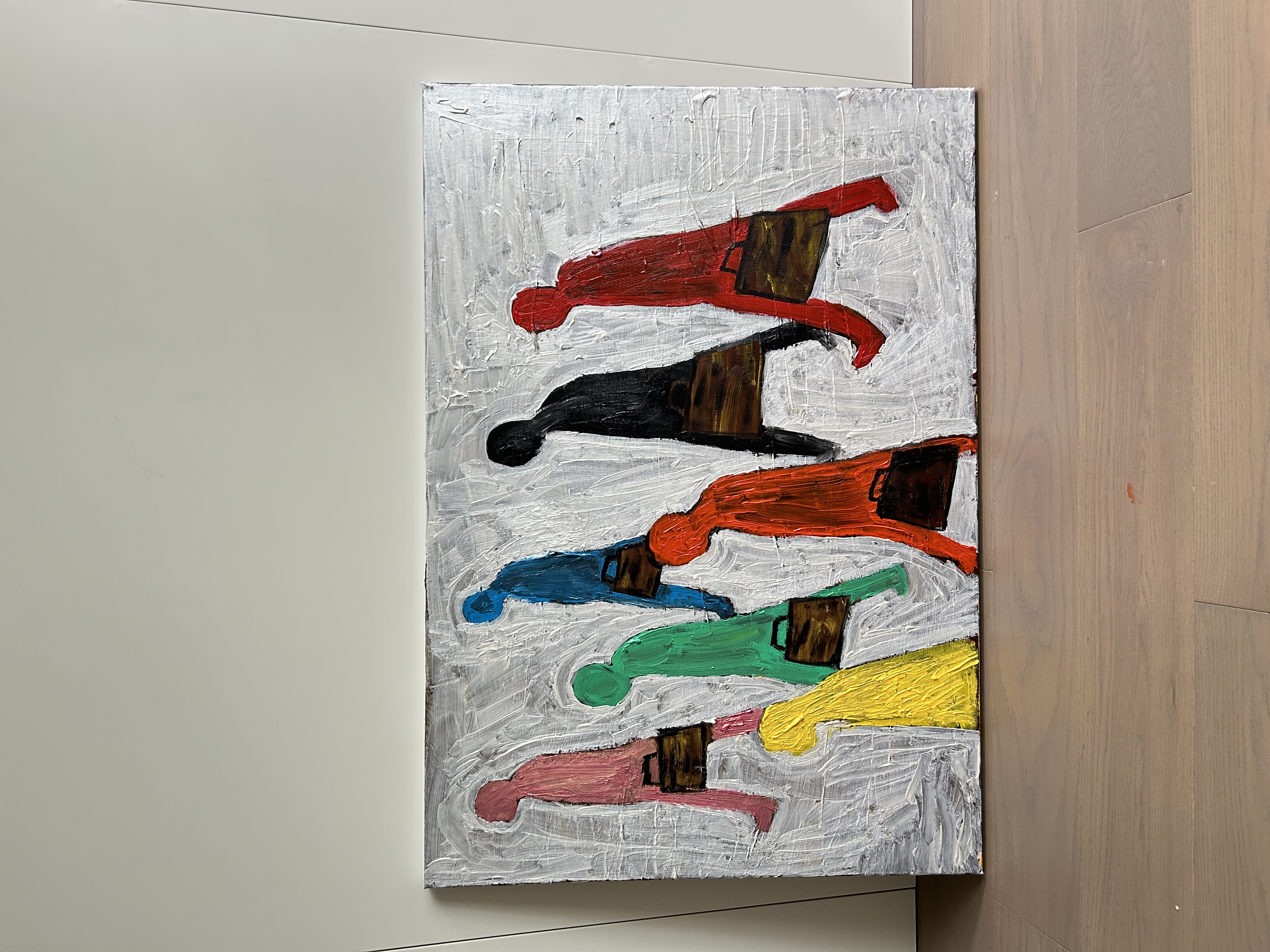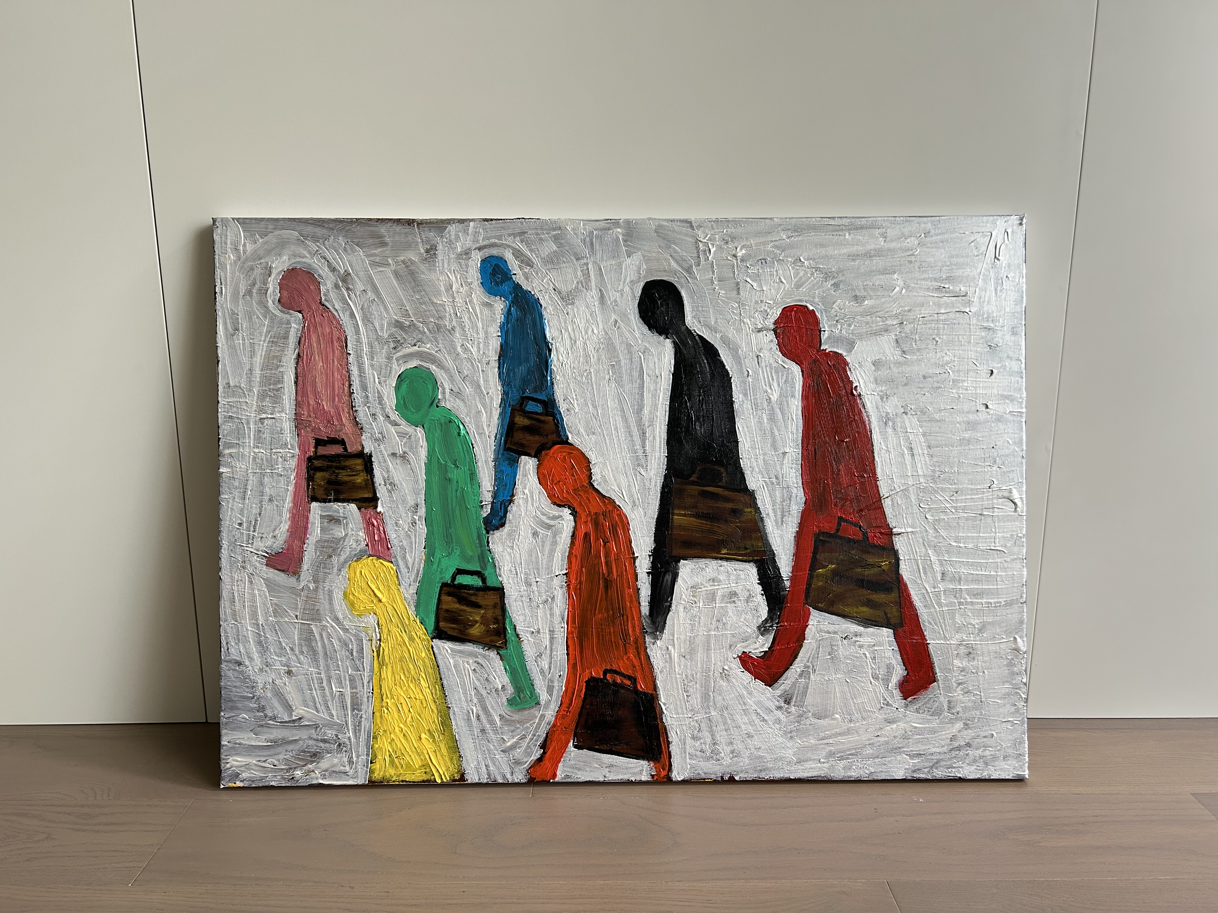 我刻意用不同的颜色去描绘他们的身影,却让他们的姿态趋同——色彩象征着个体的差异与可能性,而重复的步伐与表情的缺席,则暗示着这些差异在现实中被消解后的样子。